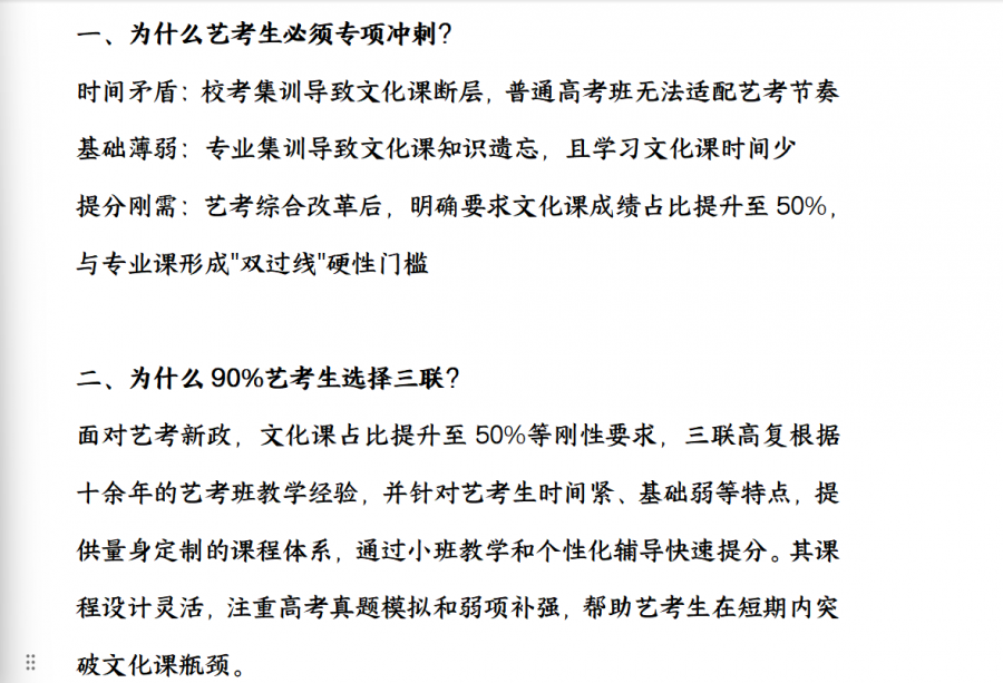 2026年浙江省艺术统考仅剩50天左右,但根据历年数据显示,专业课过线考生中43%因文化课未达本科线与理想院校失之交臂。面对艺考新政文化课占比提升至50%的硬性要求,杭州不少艺考生文化课班已启动冲刺招生,为艺考生量身定制破局方案。作为杭州高考文化课领域的标杆,三联高复班凭借其独特的教学体系,已成为艺考生文化课冲刺的。