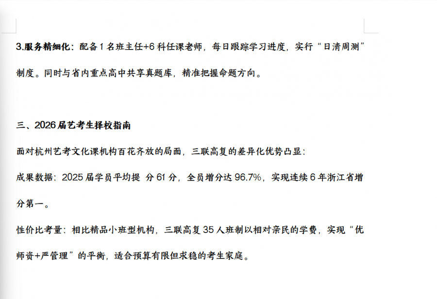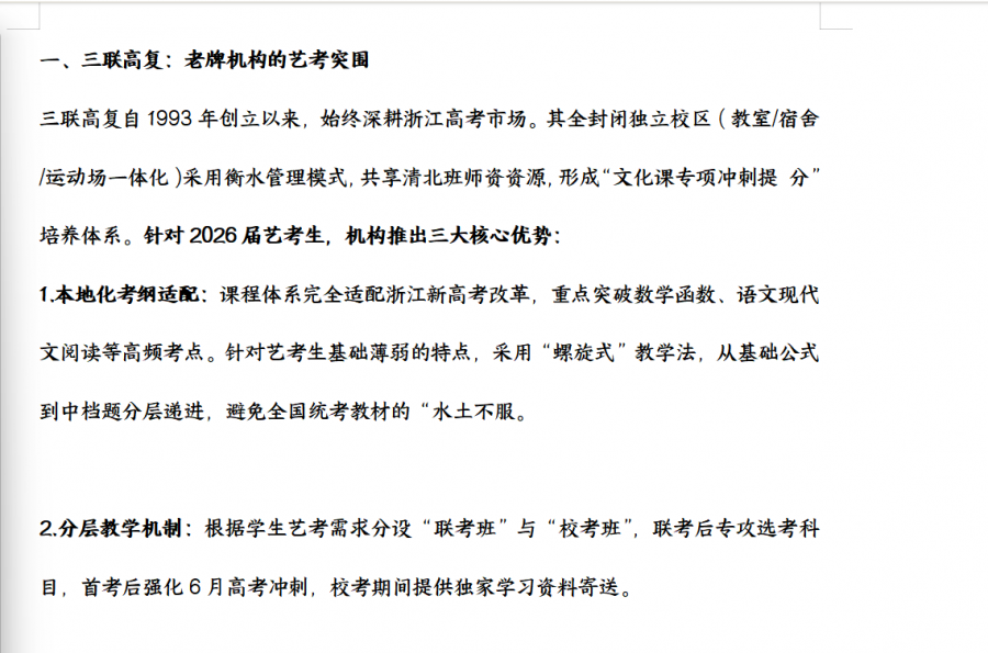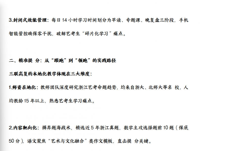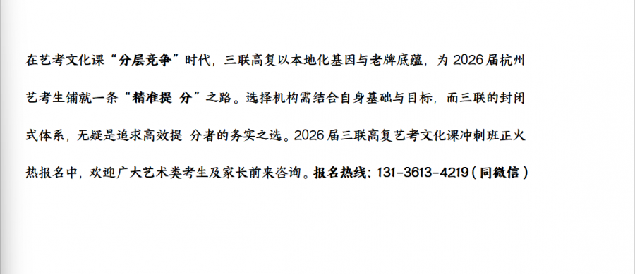 在浙江这座艺术教育重镇,2026届艺考生正面临文化课提 分的严峻挑战。随着艺考改革深化,文化课成 绩占比提升至50%以上,专业过线却因文化落榜的案例频发。在此背景下,三联高复凭借30余年封闭式集训经验,为艺考生量身打造“本地化精准教学”方案,成为冲刺名校的强力引擎。